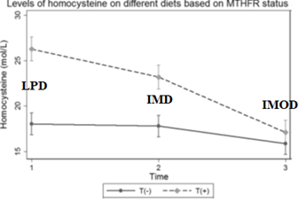 I livelli di omocisteina sono stati dosati in ogni partecipante e classificati in base al protocollo dietetico adottato e alla presenza o meno della mutazione MTHFR (T+ o T-). È evidente come si sia registrata una diminuzione molto significativa dell’omocisteinemia nei soggetti che avevano aderito alla dieta IMOD, sia per i portatori della mutazione che per chi non la presentava.